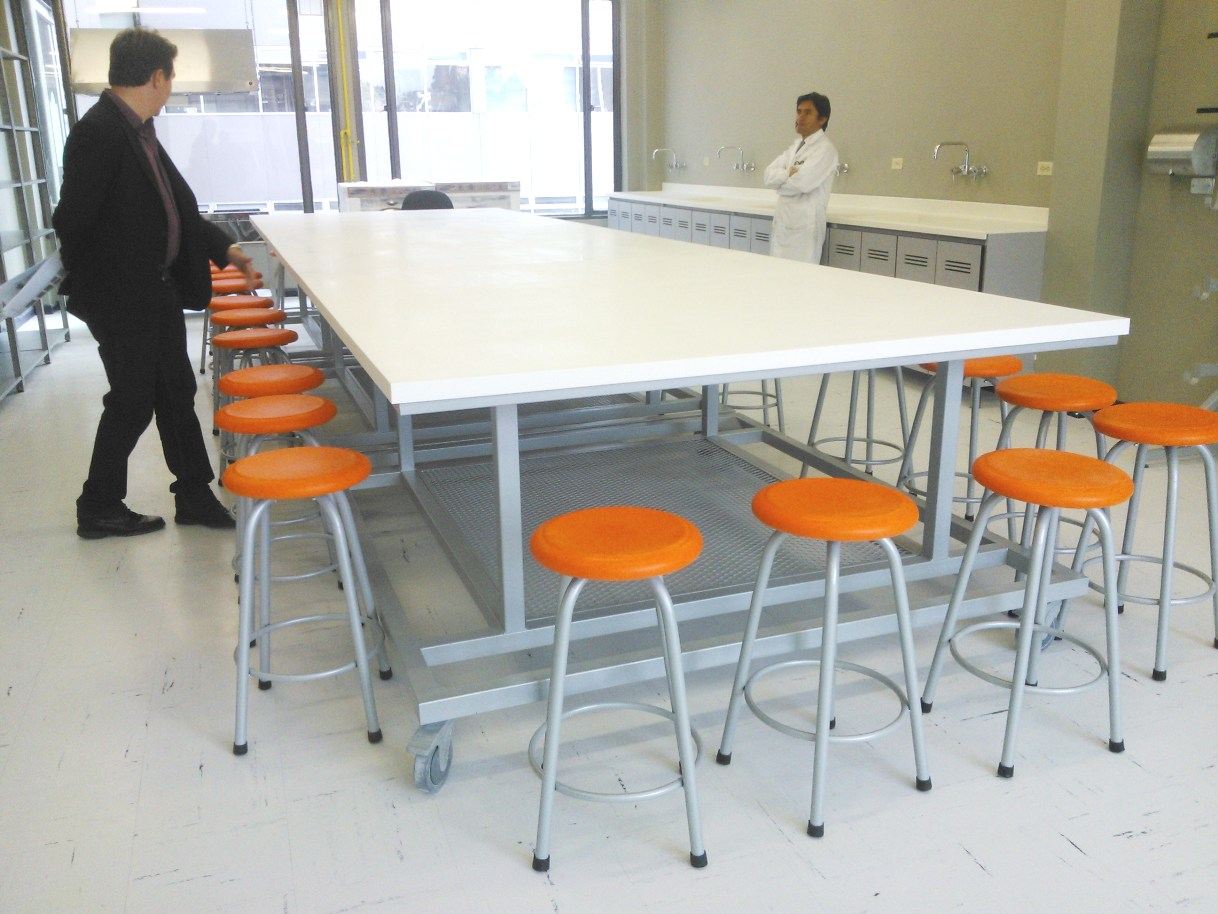 Muebles en lámina Cold Rolled, con fórmica especial o Corian con resistencia a químicos para laboratorios.