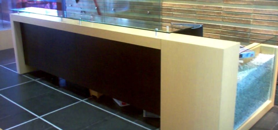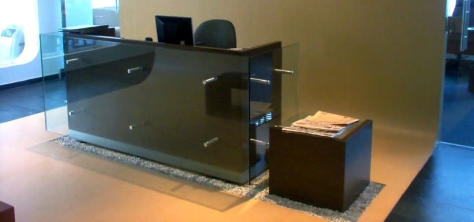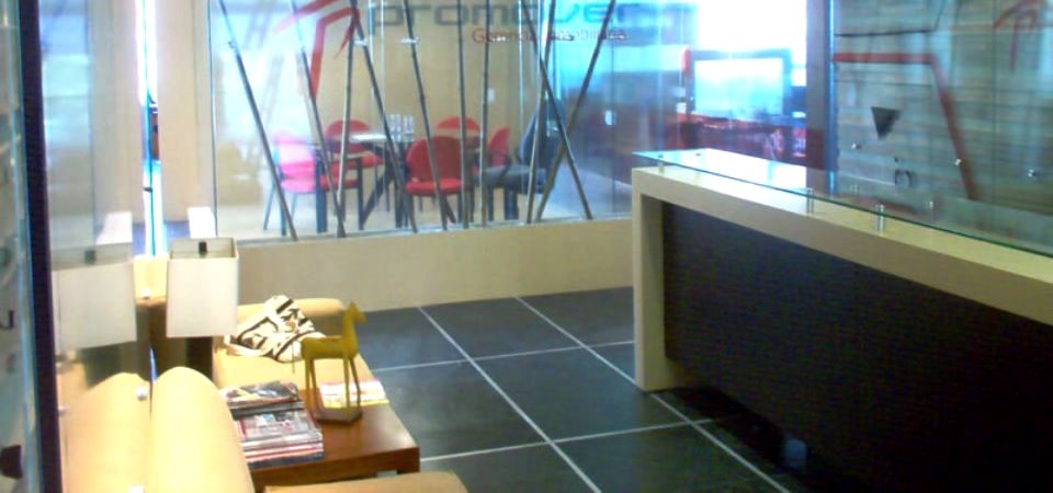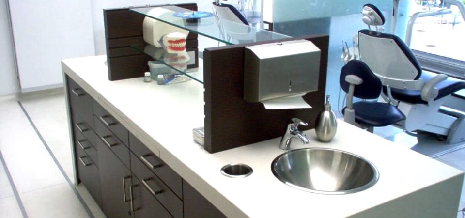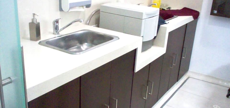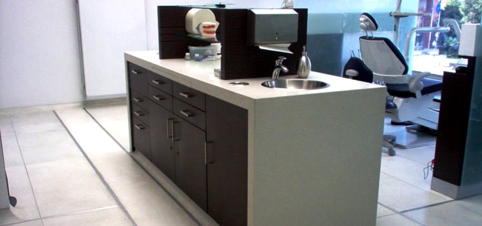 Muebles para centro odontológico, elaborados en Corian y fórmica F=8.