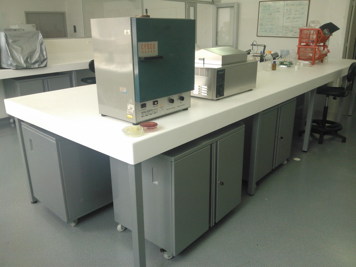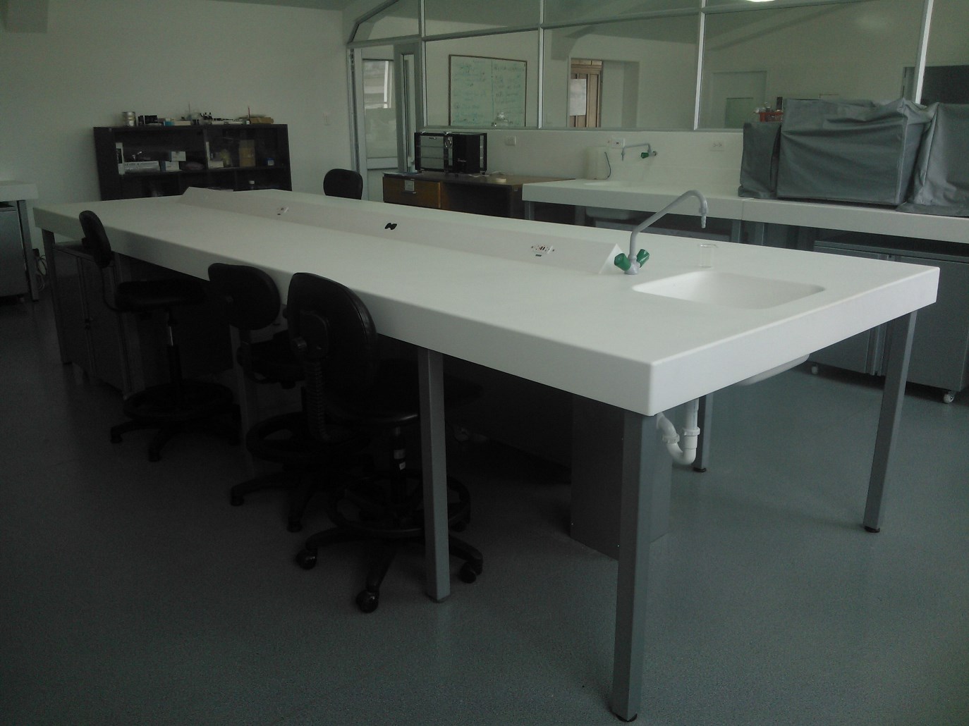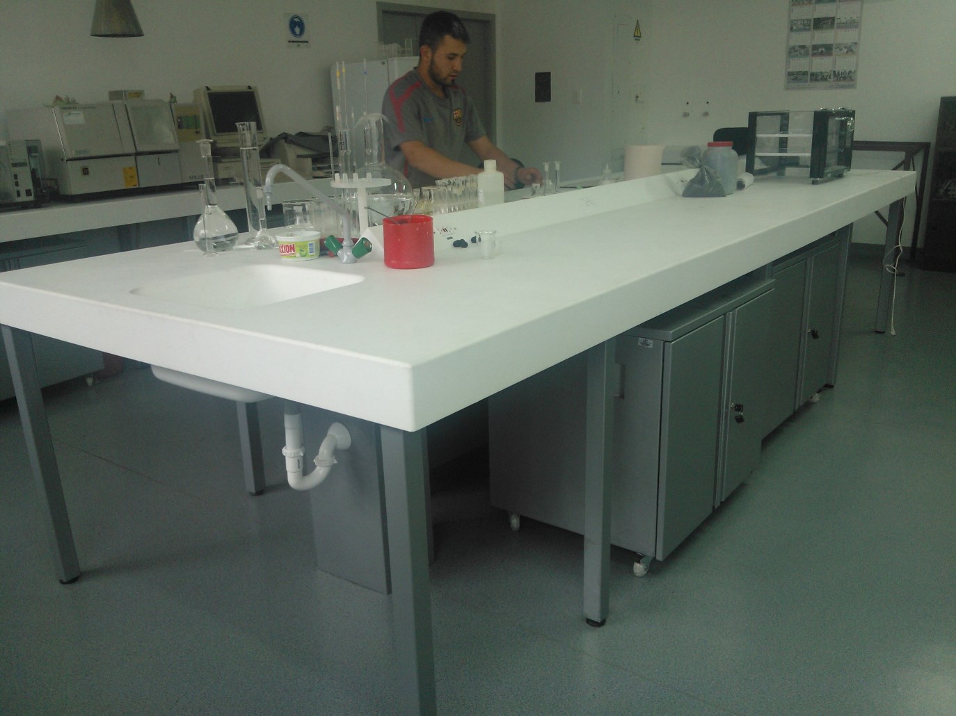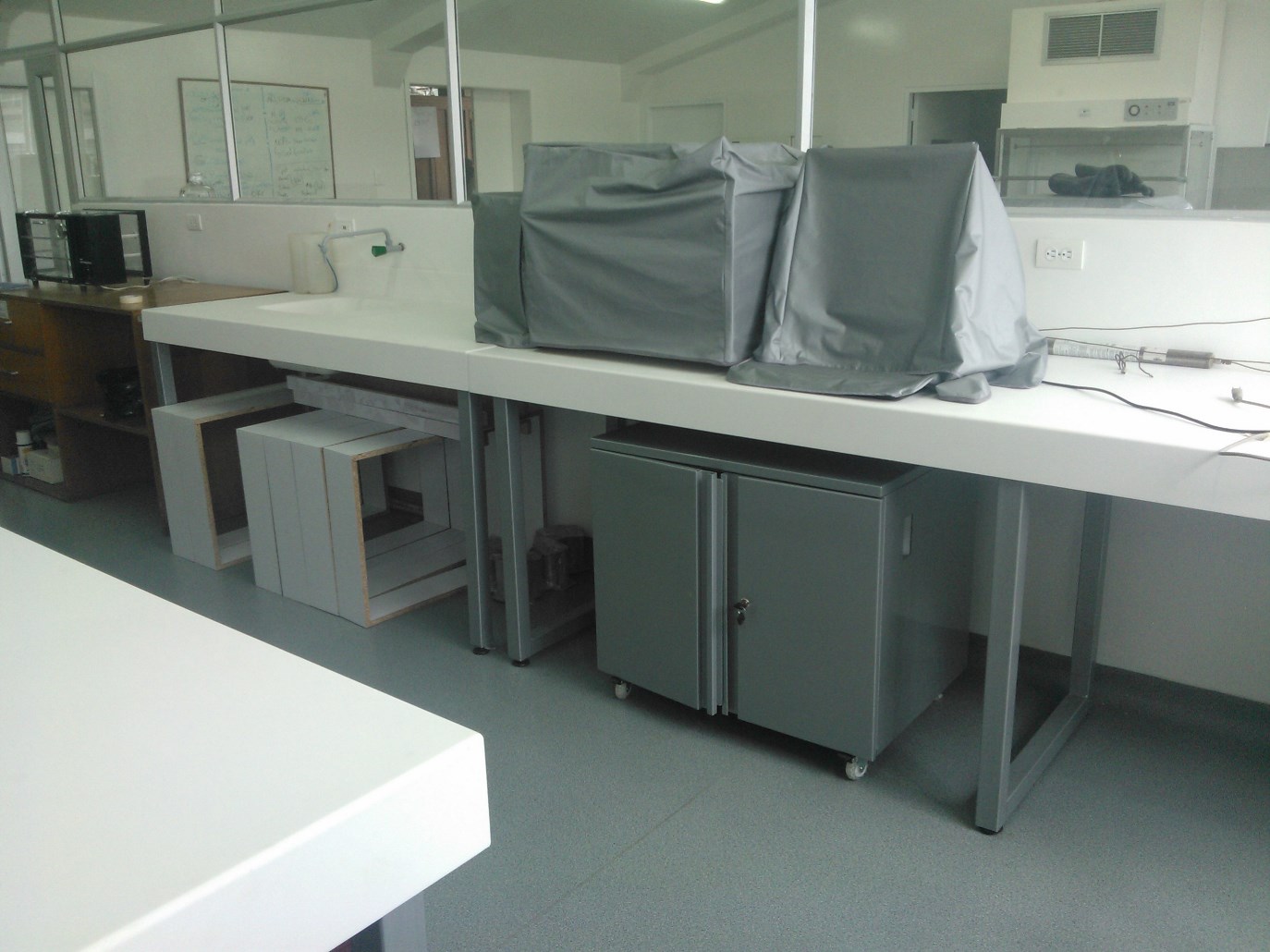 Muebles en lámina Cold Rolled, con fórmica especial o Corian con resistencia a químicos para laboratorios..