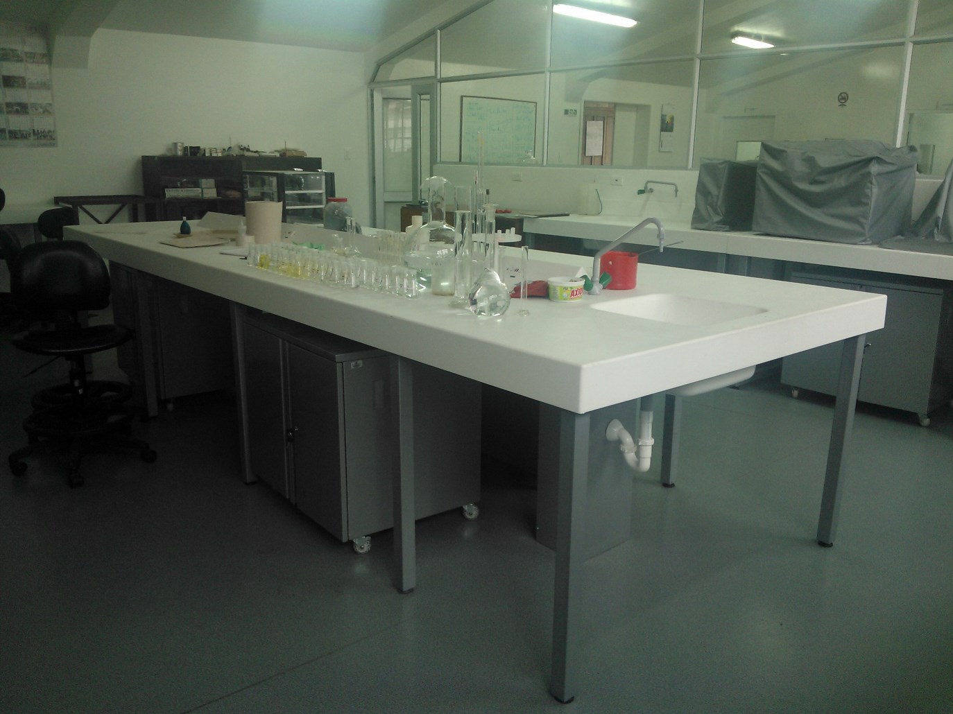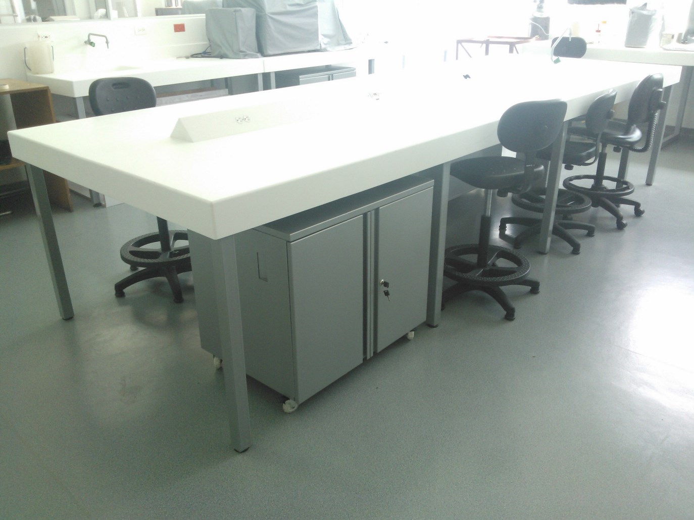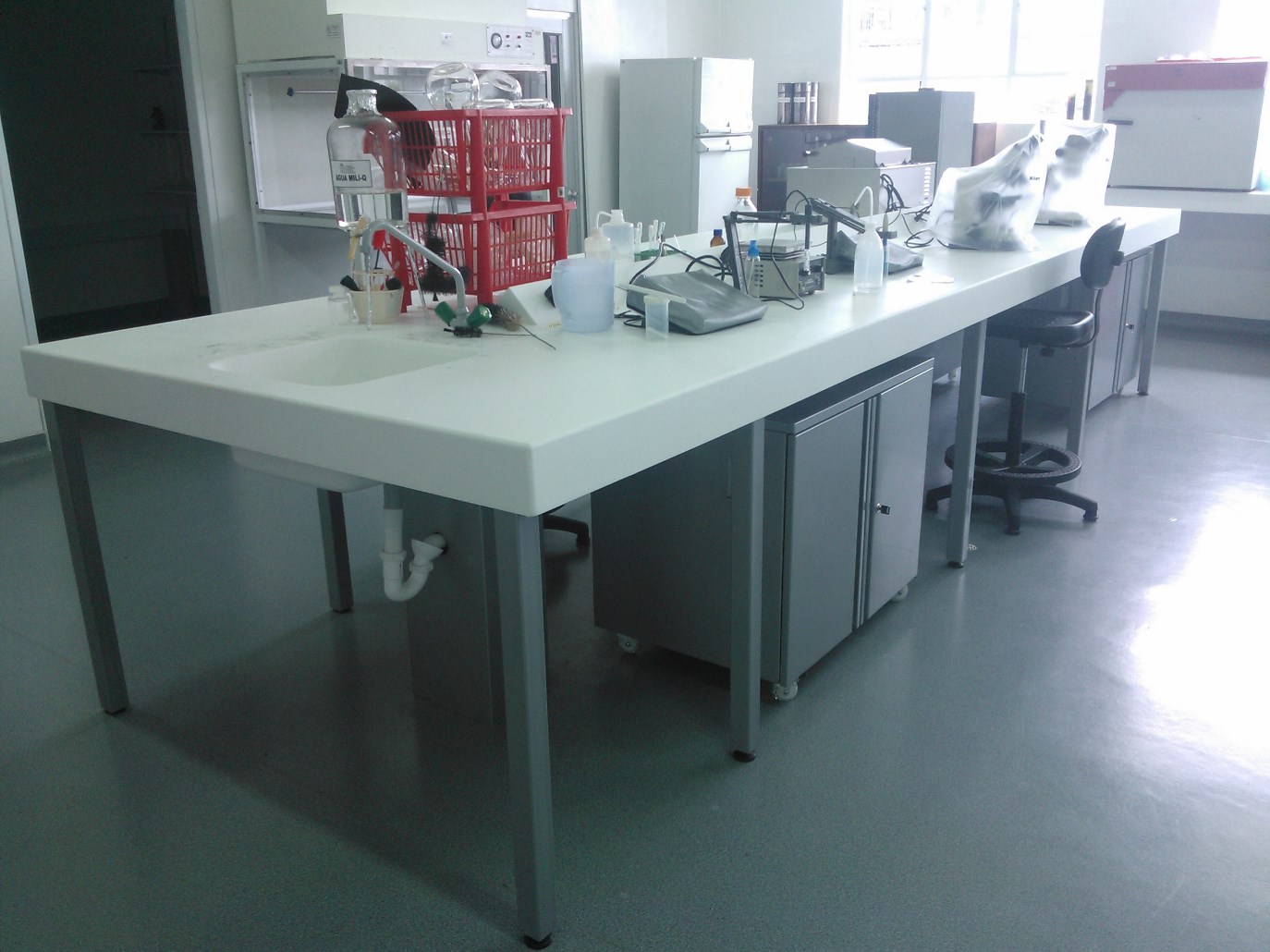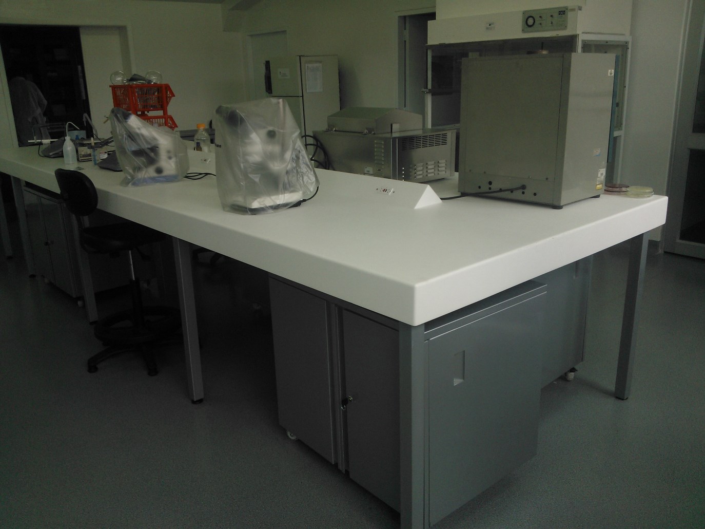 Muebles en lámina Cold Rolled, con fórmica especial o Corian con resistencia a químicos para laboratorios..