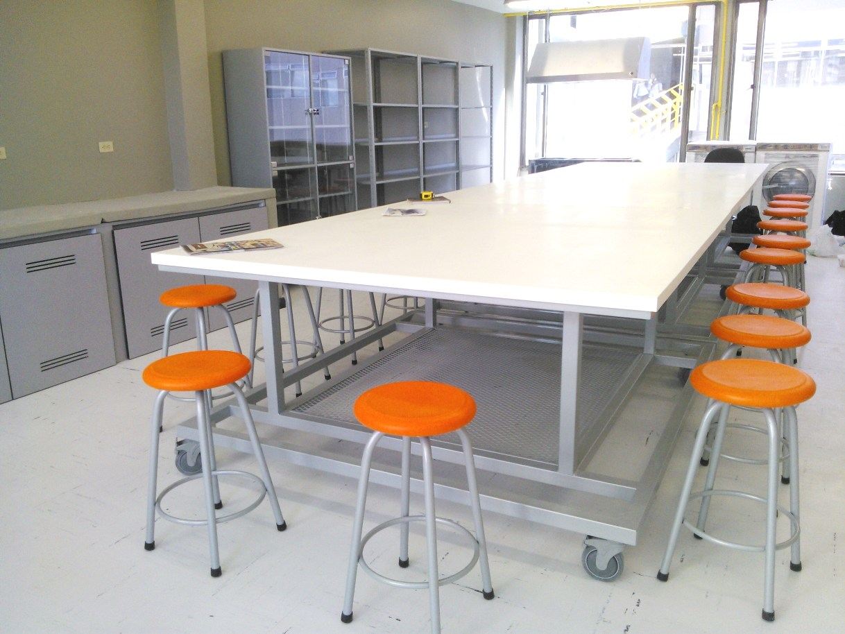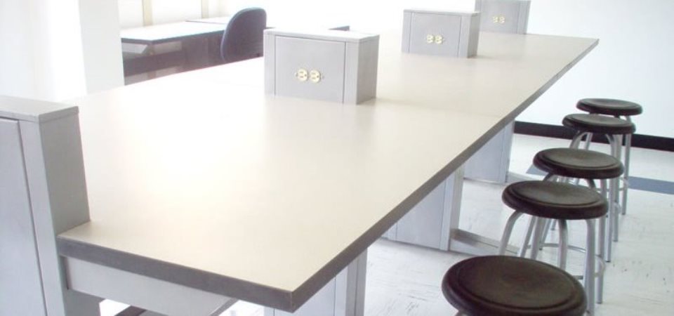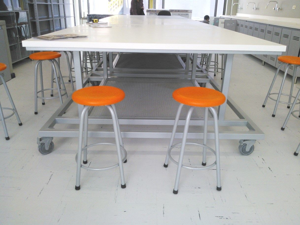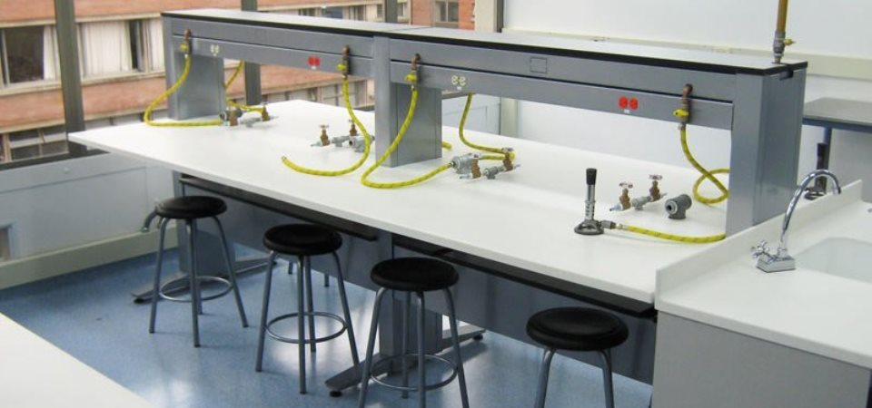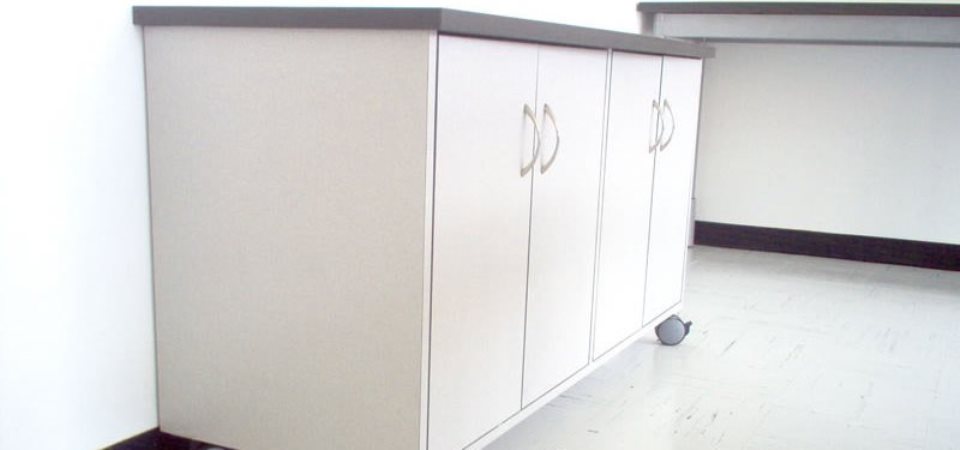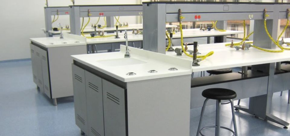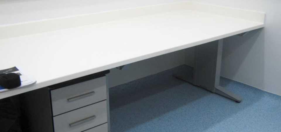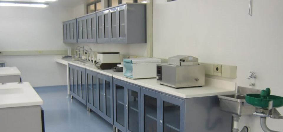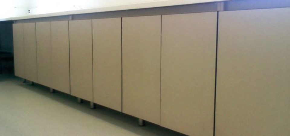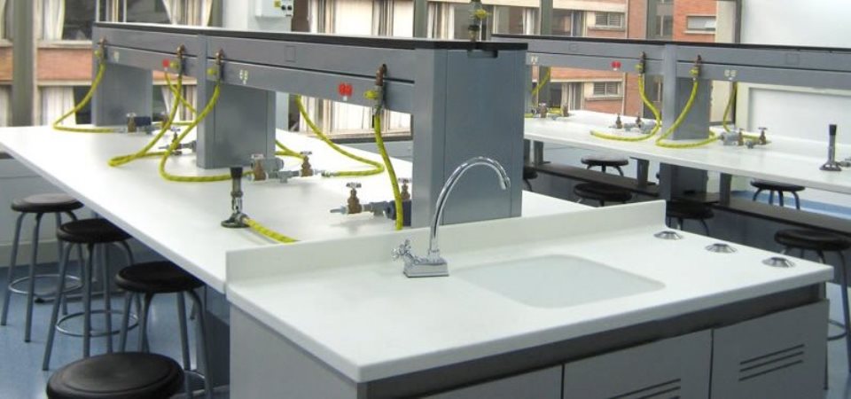 Muebles en lámina Cold Rolled, con fórmica especial o Corian con resistencia a químicos para laboratorios.