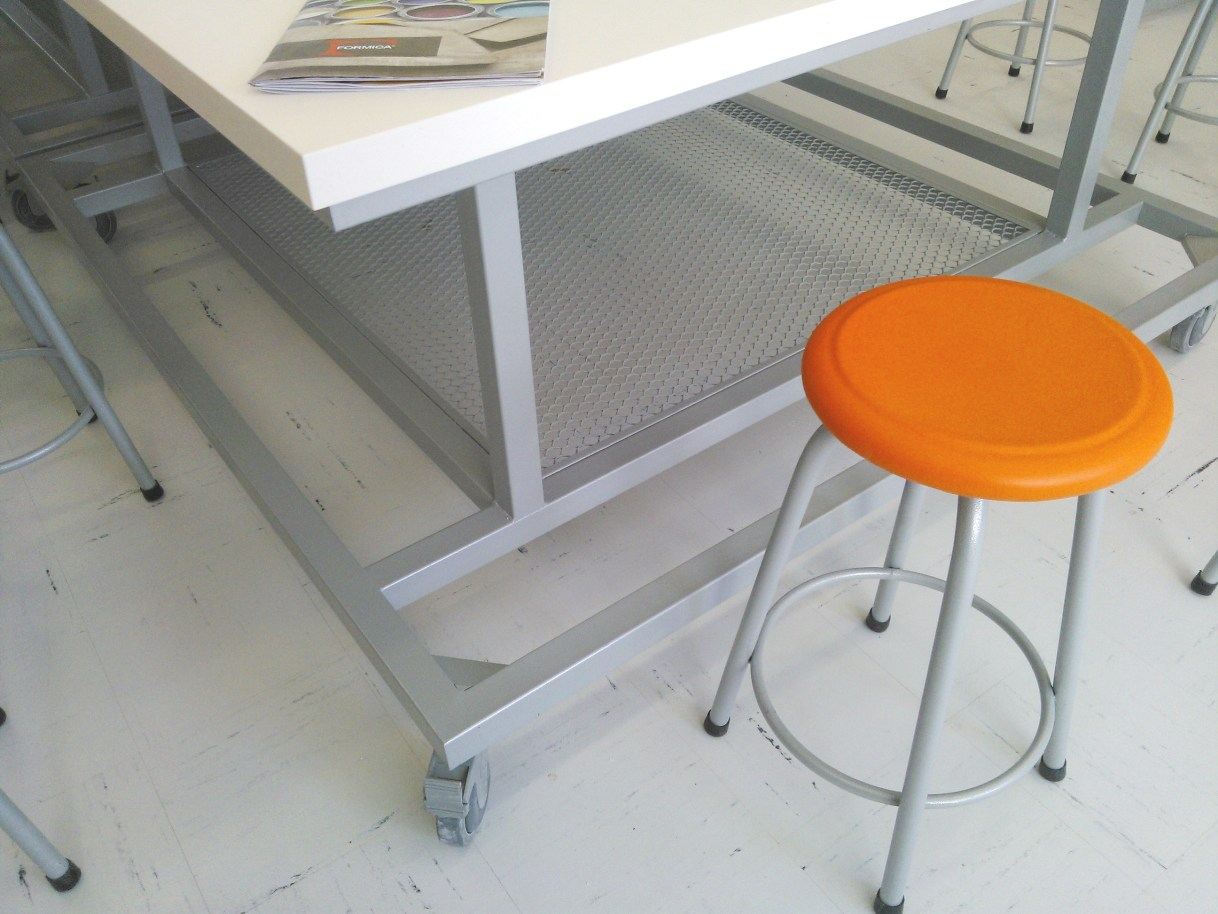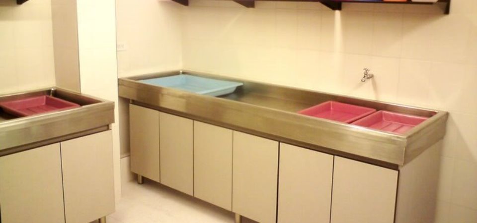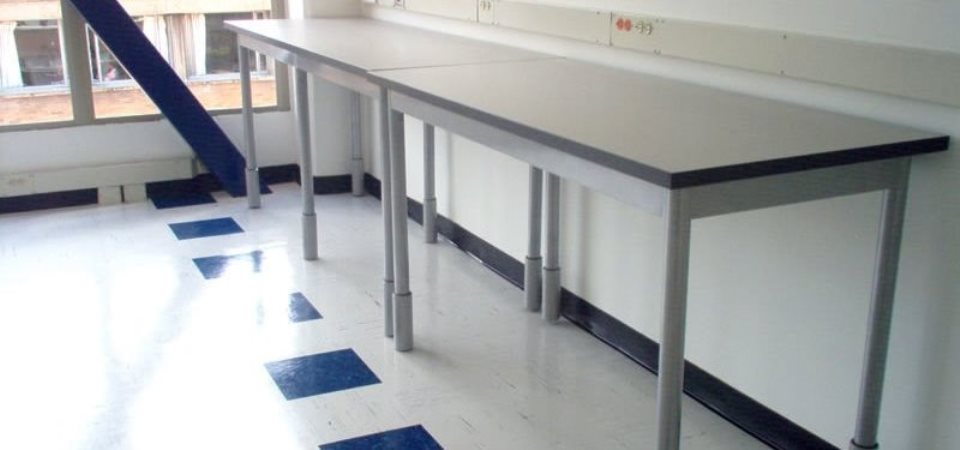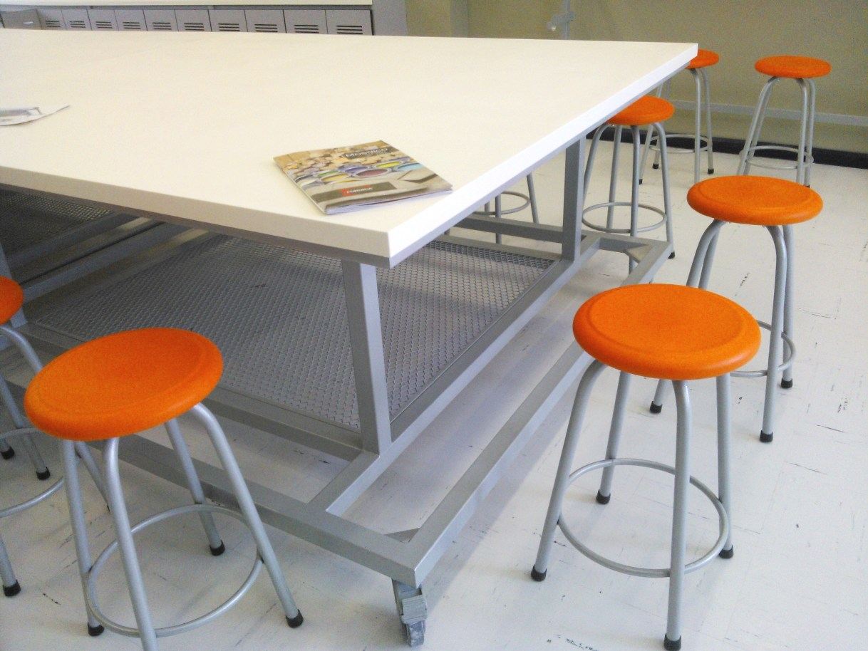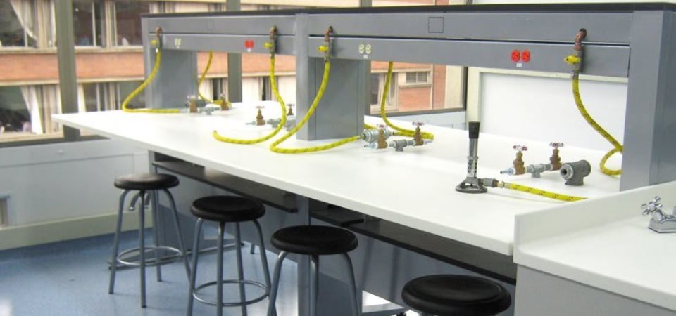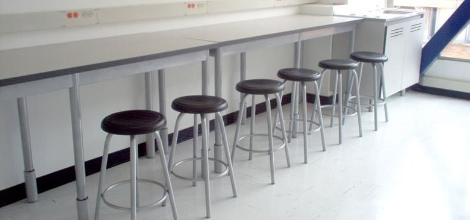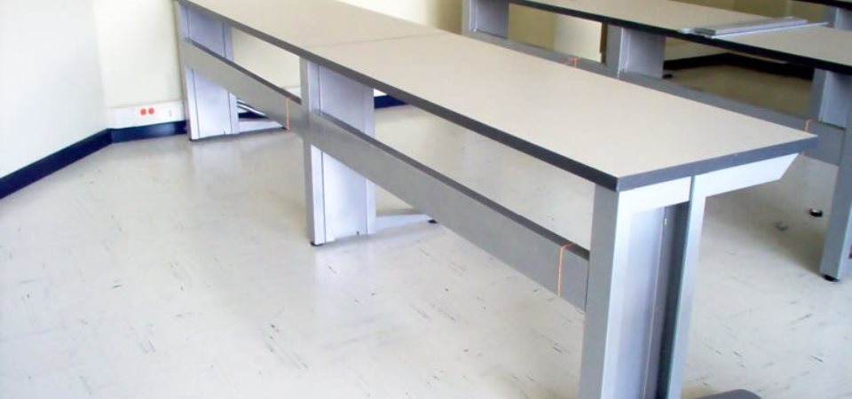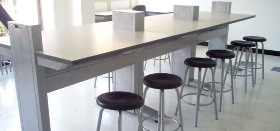 Muebles en lámina Cold Rolled, con fórmica especial o Corian con resistencia a químicos para laboratorios.